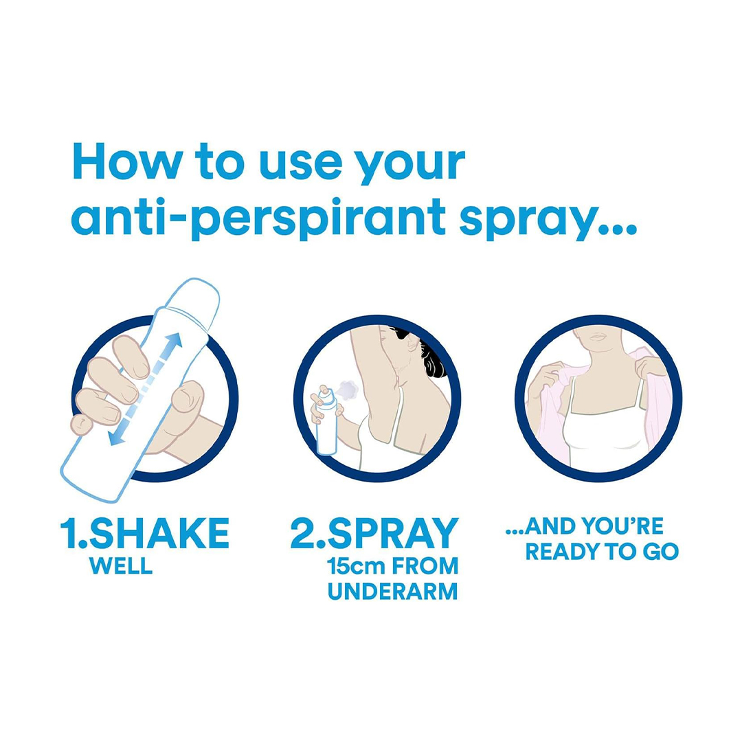 - از فاصله ۱۵ سانتیمتری روی پوست تمیز و خشک زیر بغل اسپری کنید
